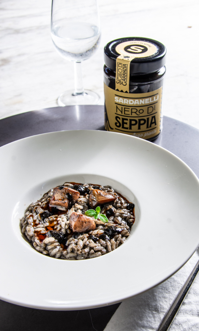 INGREDIENTI PER 4 PERSONE:320 g di riso carnaliun vasetto di sugo al nero di seppia1 litro di brodo vegetaleun bicchiere di vino bianco...