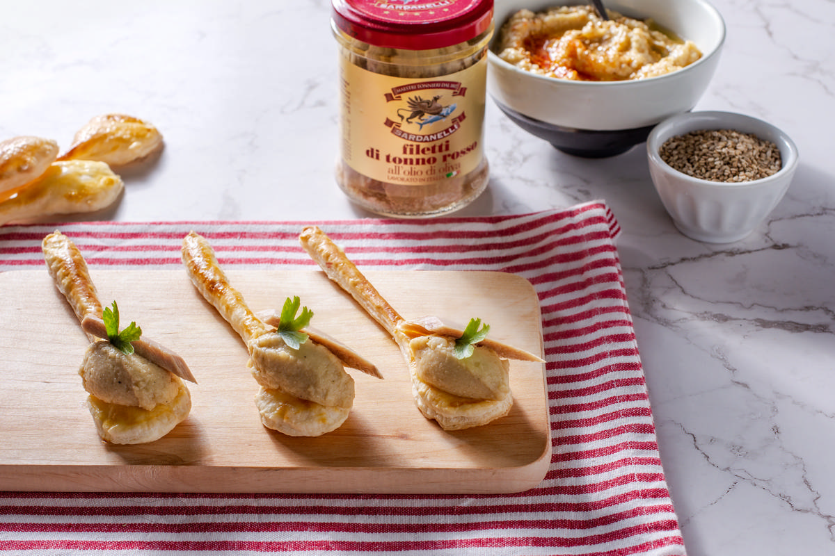 Cucchiaini di sfoglia con hummus di ceci e filetti di tonno rosso