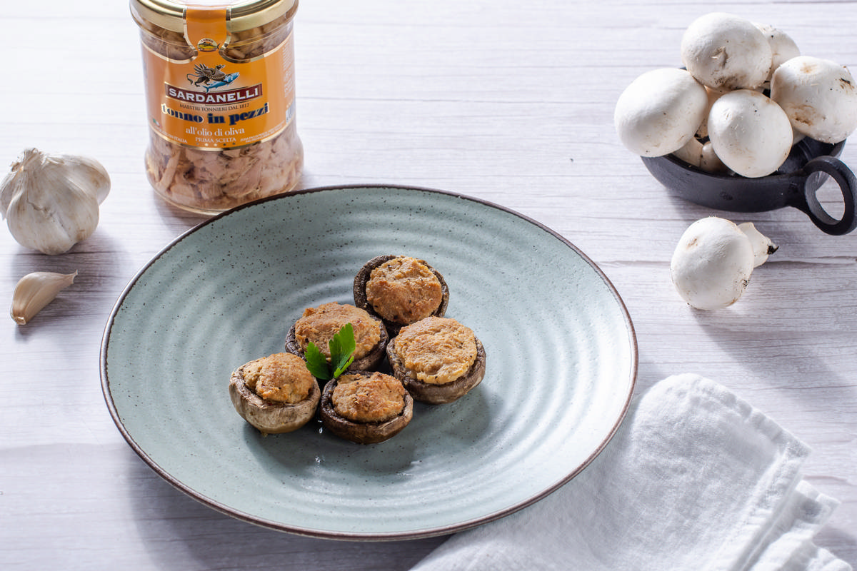 Pulire i funghi con un panno umido, tenere da parte le teste. Tritare a coltello grossolanamente i gambi e rosolare in padella con un filo di olio e lo spicchio d’aglio. In una ciotola aggiungere i funghi cotti, il tonno in pezzi sgocciolato e il prezzemolo tritato. Lavorare con una forchetta per amalgamare gli ingredienti. Riempire le teste dei funghi con il tonno e i gambi. Cospargere di pangrattato, un filo di olio e pepe. Infornare a 180°C (forno ventilato, 190°C statico) per 20 minuti o fino a che non sarà croccante la superficie. Servire caldi.