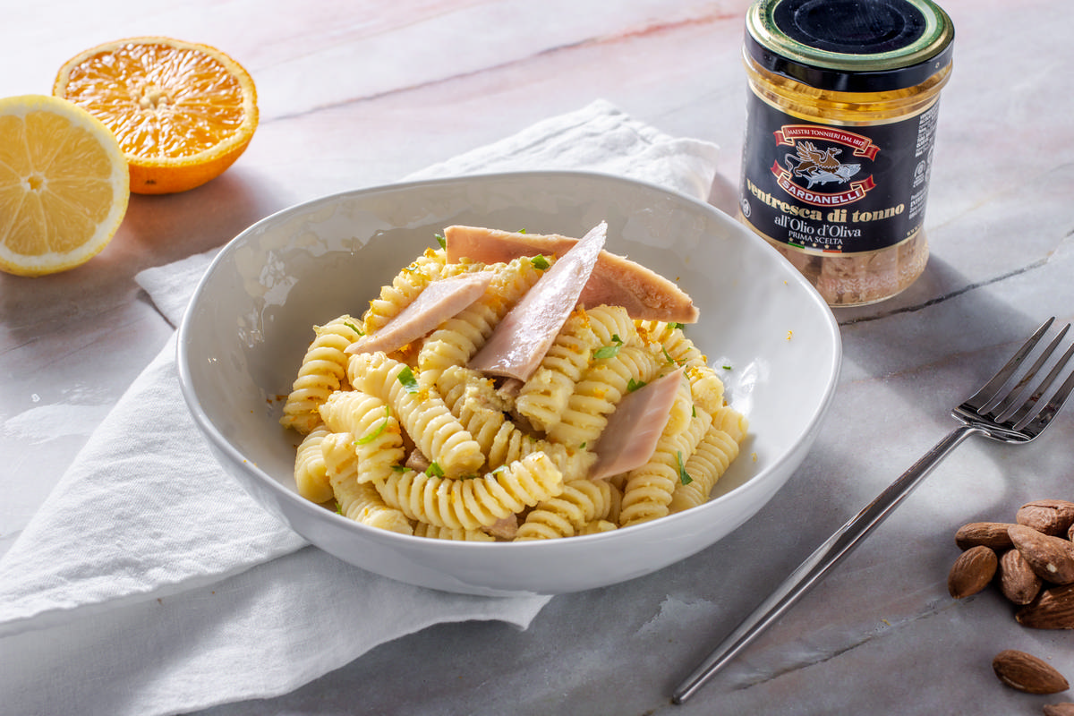 Aggiungere in un mixer qualche chicco di sale grosso, le mandorle, il parmigiano, un pezzetto di aglio, la buccia grattugiata del limone e dell’arancia e la polpa di metà di entrambi gli agrumi. Frullare e aggiungere olio a filo. Cuocere la pasta in abbondante acqua salata. Scolare al dente e condire con il pesto. Mantecare aggiungendo i filetti di ventresca di tonno. Servire caldo.